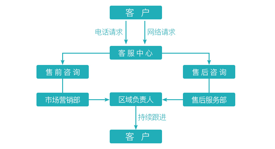 3、無論客戶是電話請求還是網(wǎng)絡(luò)請求,客服中心都會根據(jù)客戶需求進(jìn)行分類后直接轉(zhuǎn)接相應(yīng)部門,部門負(fù)責(zé)人會根據(jù)客戶需求轉(zhuǎn)接區(qū)域負(fù)責(zé)人,區(qū)域負(fù)責(zé)人將與客戶之間對接高效快捷。
