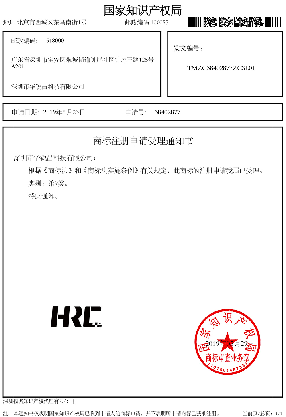 “HRC ”商標(biāo)注冊(cè)品牌受理通知書