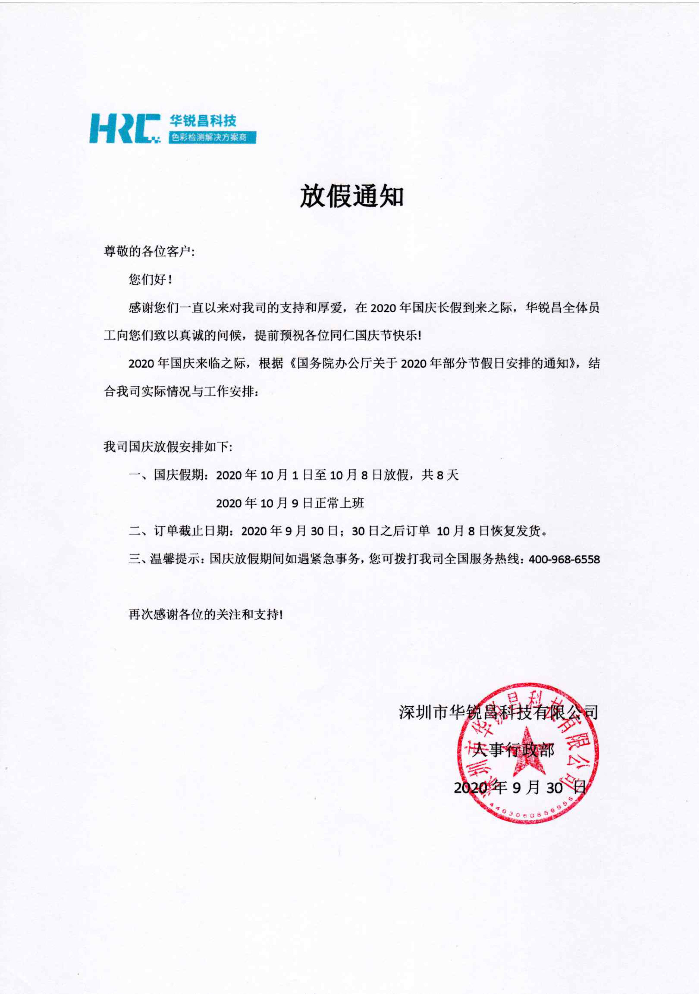 三、溫馨提示:國(guó)慶放假期間如遇緊急事務(wù),您可撥打我司全國(guó)服務(wù)熱線(xiàn):400-968-6558