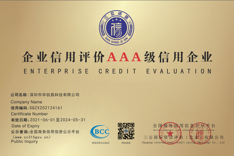 企業(yè)信用評價(jià)AAA級為企業(yè)信用評價(jià)中最高的信用等級,是對深圳市華銳昌科技有限公司實(shí)力和市場信用的認(rèn)可,表示深圳市華銳昌科技有限公司經(jīng)營良好,發(fā)展前景廣闊,風(fēng)險(xiǎn)防范能力強(qiáng),是最可信賴的商業(yè)合作伙伴。
