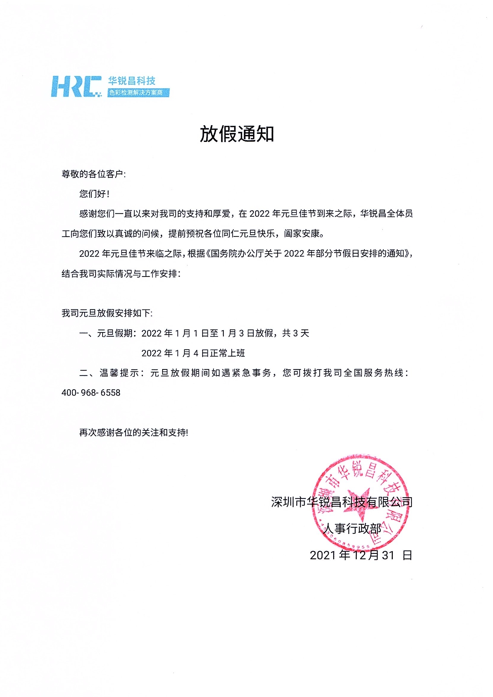 2022年元旦放假通知_標準光源箱|對色燈箱|色差儀|光澤度儀|涂層測厚儀_HRC大品牌生產(chǎn)廠家