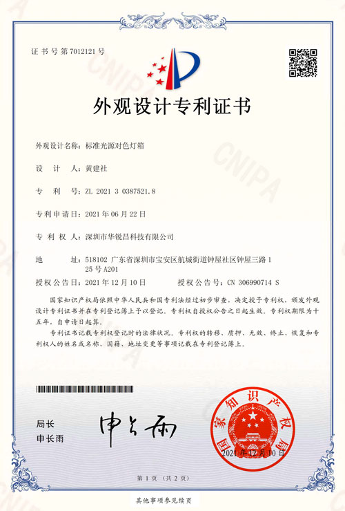 標(biāo)準(zhǔn)光源對(duì)色燈箱外觀設(shè)計(jì)專利證書