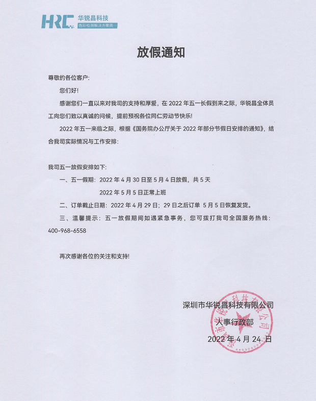2022年五一放假通知_標(biāo)準(zhǔn)光源箱|對色燈箱|色差儀|光澤度儀|涂層測厚儀_HRC大品牌生產(chǎn)廠家