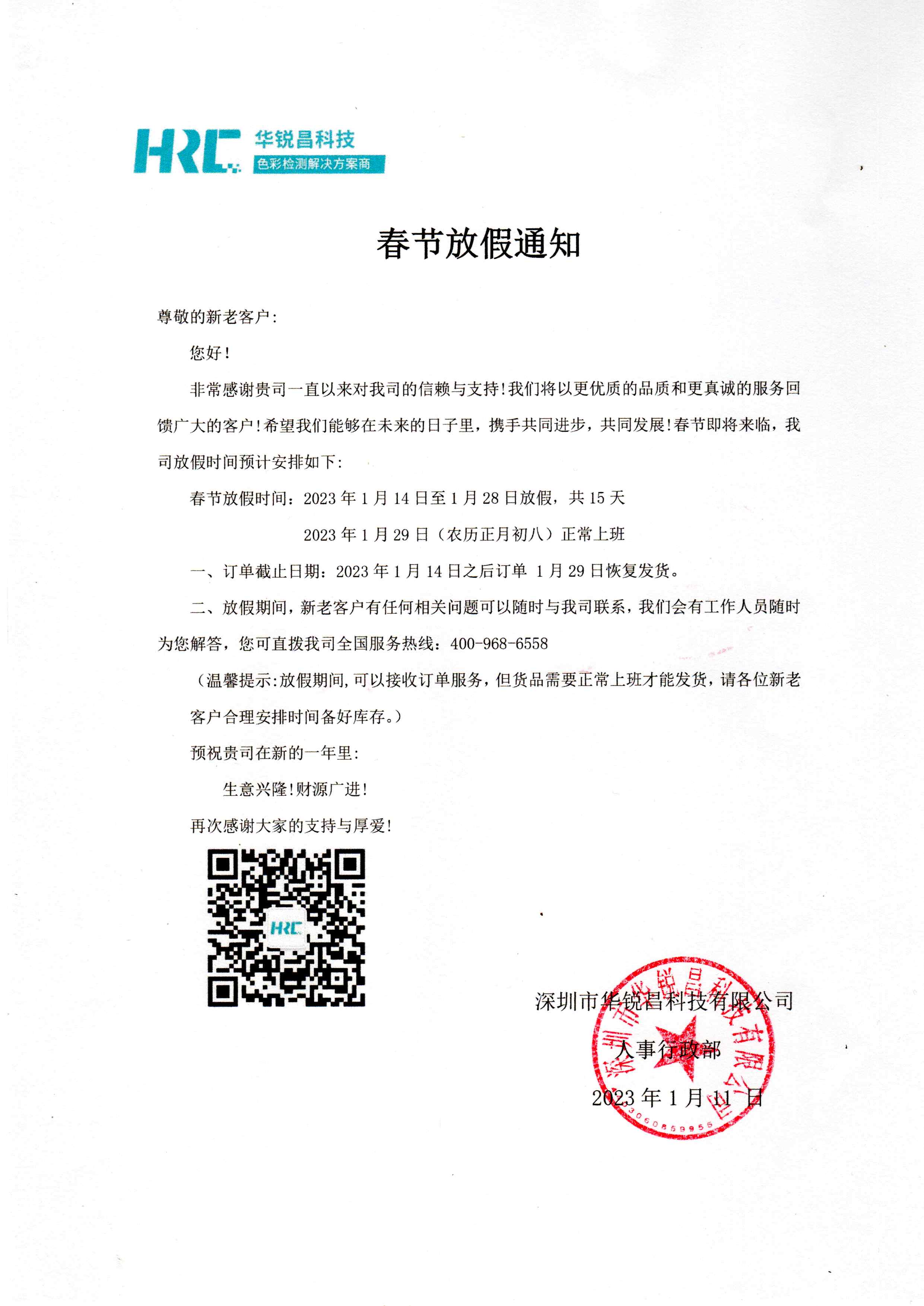 2023年春節(jié)放假通知_標(biāo)準(zhǔn)光源箱|對色燈箱|色差儀|光澤度儀|涂層測厚儀_HRC大品牌生產(chǎn)廠家